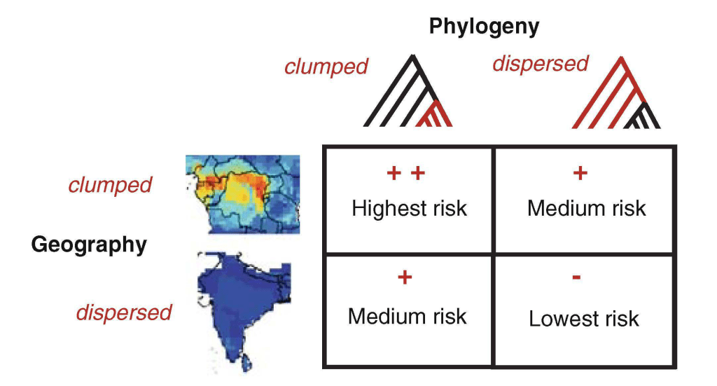 Representation of the interaction between phylogeny and geography that may determine the frequency of host shifts within host communities. In the maps, warmer colors represent areas with many overlapping species ranges (geographically clumped distributions). In the phylogeny, red branches represent samples of closely related taxa (phylogenetically clumped). More…